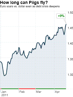 ????Not that you'd know the difference to look at the market. The annual cost of insuring $10 million of Greek debt soared past $1.4 million this week, and the yield on 10-year Greek bonds hit an eye-watering 15%. Credit spreads hit new highs in Ireland and Portugal too. ????Investor flight from Greece, Ireland and Portugal has the makings of an existential problem for the euro zone. The European Union has spent the past year bailing out weak states and their too-big-to-succeed banks, without addressing the productivity problems that laid the weaker states low in the first place. ????Yet the euro, thanks to the inflation-squashing vigor of the European Central Bank, is now trading within 10% of the all-time high it hit against the dollar in 2008, just before the global economy came apart at the seams. The higher the euro goes, the more stress on laboring European economies. How long can this go on? ????In an ugly new twist on Keynes' aphorism, it is starting to look like the market can stay irrational longer than Europe's weaker states – or their banks -- can stay solvent. When investors finally catch on, the fall could be brutal. ????"We're peering over the precipice right now," says Scott Minerd, chief investment officer at Guggenheim Partners. He is betting the euro will fall from a recent $1.46 (see chart, right) toward parity with the dollar or even beyond, as investors finally divine the extent of Europe's problems: "There is just no way out when you start to add up all the numbers." ????The unhappy math starts with the banks. In a replay of the subprime crisis here, the banks in Europe are politically powerful -- but financially weak, largely opaque and highly exposed to the worst case scenario, in this case a sovereign default. ????The three weak European states account for just 5% of annual European Union economic output. But EU banks hold $147 billion of Greek sovereign bonds and $115 billion of Irish and Portuguese debt – including $108 billion of bonds held by EU banks outside those countries. ????And if anything, keeping the banks healthy over there is more important to growth than it is here. Banks are responsible for 74% of credit extension in the euro area, the Organization for Economic Cooperation and Development estimates. That compares with just 24% in the land of Fannie Mae mortgages. ????"The problems start with weak capitalization and a lot of interconnectedness, which means problems in one place can easily become systemic," says Daniel Gros, director of the Center for European Policy Studies in Brussels. "But it's hard to put a number on exactly how bad it is." ????Confidence in the banks hasn't been helped by regulators' failure to include a sovereign default in the stress tests they are running again this spring. Fears about what the banks really look like could kindle a flare-up of the sovereign debt crisis into a regional headache into a Continent-wide contagion. ????So far, the ECB and European politicians have done just enough to keep the pot simmering without rolling into full boil. But the weak states remain vulnerable to a loss of confidence by depositors. ????It is an international bank run that pushed Ireland into its unpopular bailout last fall. Deposits held at Irish banks by nonresidents plunged 49% from a year ago through February, Minerd estimates. ????So far, there is no evidence of a run on Portuguese banks. But Gros worries what might happen if funds start fleeing from Greece -- let alone Spain, which is much bigger than any of the bailout three. Its banks could face rising losses as the ECB raises rates, punishing an economy already laboring, if you will, under 20% unemployment. ????"I don't really see a solution in Greece or Ireland or Portugal that doesn't involve haircutting the debt," Minerd says. As that plays out, he adds, "We are looking at a massive credit crunch in Europe over the next 18 to 24 months." ????The dollar, believe it or not, also rises. |