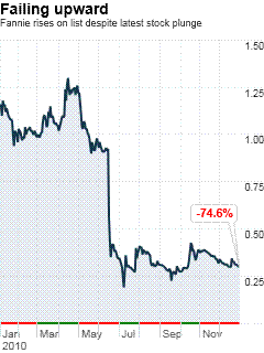????The company is Fannie Mae (FNMA), the government-controlled mortgage investor whose collapse three years ago was a major milestone along the road to national financial ruin. ????Much has been made of how Fannie and its little brother Freddie Mac (FMCC) have become the lenders of first and last resort in the troubled U.S. mortgage market. More than nine in 10 loans made nowadays are either financed or guaranteed by the companies or federal cousins such as Ginnie Mae, in an arrangement that everyone from Tim Geithner on down deems unsustainable. ????But that isn't how Fannie ended up rising to 5 on the Fortune 500, behind only Wal-Mart (WMT), Exxon (XOM), Conoco (COP) and Chevron (CVX), and up from 81st last year. ????The driver of Fannie's big move up the charts (and Freddie's too, to No. 20) is an accounting change that aims to keep big financial companies from hiding risks by keeping them off the balance sheet. Combine this with Fortune's longstanding policy of calculating its list using gross revenues -- rather than the net revenues that Wall Street tracks -- and you have two too-big-to-fail outfits looking bigger, if not better, than ever. ????In Fannie's case, the two accounting rules – ASC 860, which aims to make companies list the assets they control and the liabilities they incur, and ASC 810, which calls for financial companies to put off-balance sheet entities back on balance sheet – had the effect of sending gross revenue soaring to $154 billion from $29 billion a year earlier. ????That number more than quintupled because Fannie got to recognize the income from all the mortgages that it previously held off balance sheet. The rise vaulted Fannie past giant, reasonably healthy industrial companies such as Ford (F) and Hewlett-Packard (HPQ) -- even as Fannie lost $14 billion and the tab on its federal bailout ran to $91 billion. ????But the income gains the company recognized from the mortgages were illusory -- offset by interest expense, notably the cost of administering the trusts, which make regular payments to investors. ????As a result, the company's net revenue -- the number investors tend to track, to the extent they bother looking at this sorry outfit anymore -- actually fell 22% from a year ago, to $17.5 billion. ????This back and forth gives you some idea why the financial reports Fannie publishes with the Securities and Exchange Commission don't even mention the gross revenue number. Using net revenue, Fannie would have ranked a lowly No. 94 this year. ????But given the pathetic state of our national finances and Fannie's not insubstantial role in the same, maybe it's about time we gave this all-but bankrupt institution its due. |