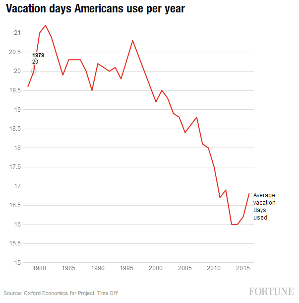 It's become a perennial story: Americans are terrible at taking all of their allotted vacation days. That was true again in 2016, with 54% of employees ending the year with unused time off, collectively sacrificing 662 million vacation days, according to a study the U.S. Travel Association’s Project Time Off released Tuesday. While more than half of employees forfeited paid time off at year's end, some bright spots in the survey results hint that Americans may be in the process of reversing their bad vacation habits. The share of employees who failed to use all their vacation time was actually down one percentage point from 55% in 2015. And the average number of vacation days logged by employees—16.8—was up from 16.2 in 2015 and an all-time low of 16 in 2014 and 2013. " Overall Americans are using more vacation days," says Katie Denis, senior director of Project Time Off who authored the report. "There's been a slight uptick," she said, adding that it could be "the beginning" of a more significant turnaround. |