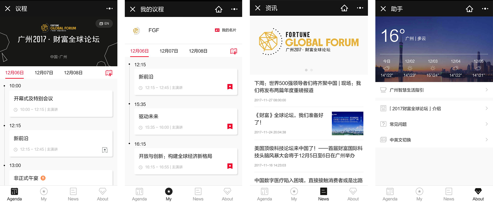 現在,參會嘉賓通過微信掃一掃小程序碼或或使用微信搜一搜“財富全球論壇”即可快速訪問小程序,實現一鍵查詢、收藏并管理會議議程、了解會議周邊服務等功能;小程序還提供了中英文切換的功能,方便不同語種的參會嘉賓進行使用。